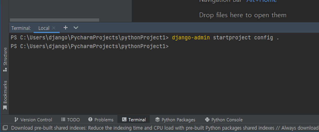 -터미널에 django-admin startproject config . 입력 중요!! . 을 빼면 안
