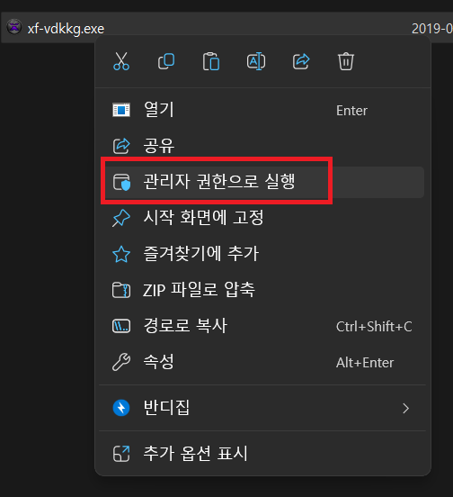 옮긴후 xf-vdkkg.exe를 관리자 권한으로 실행